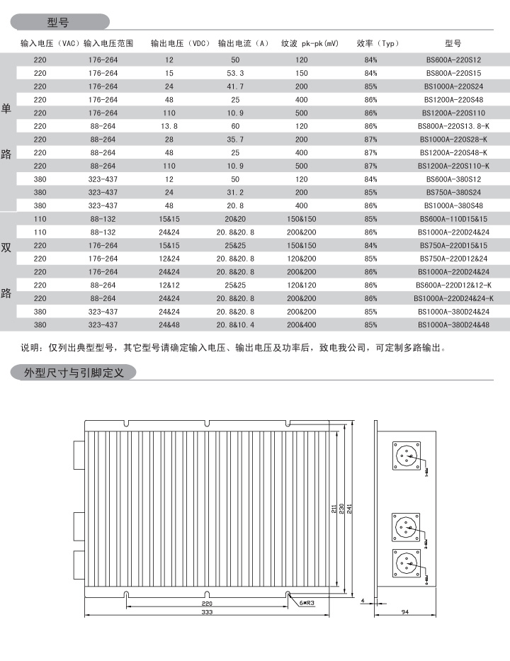 功率:500-1000W 輸入電壓:220VAC(176-264V 88-264V) 380VAC 輸出路數(shù):?jiǎn)温? 雙路 多路(定制) 外形尺寸:333*241*94mm 安裝方式:一體式