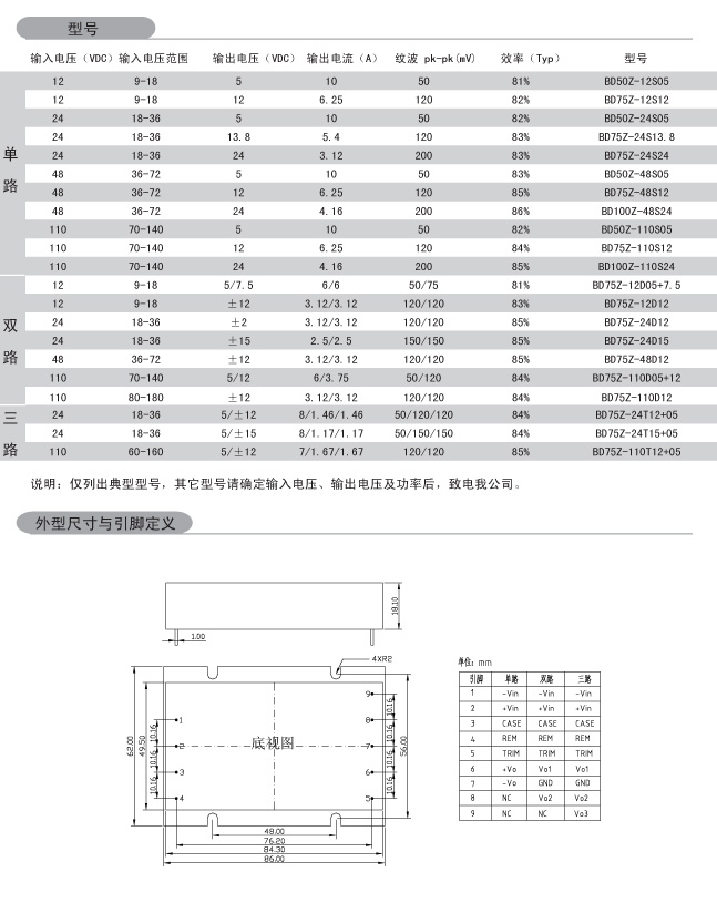 功率:30-100W 輸入電壓:9-18VDC 18-36VDC 36-72VDC 70-140VDC 200-400VDC 輸出路數(shù):單路 雙路 三路 外形尺寸:86*62*18.1mm 安裝方式:引針式