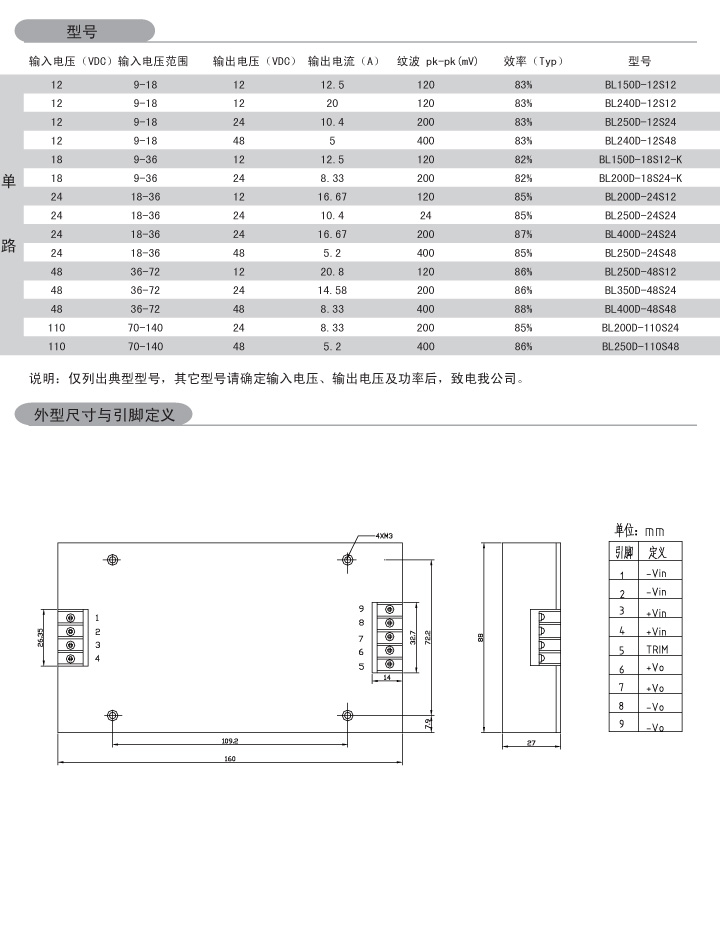 功率:150-500W 輸入電壓:9-18VDC 18-36VDC 36-72VDC 9-36VDC 70-140VDC 輸出路數:單路 外形尺寸:160*88*27mm 安裝方式:端子式